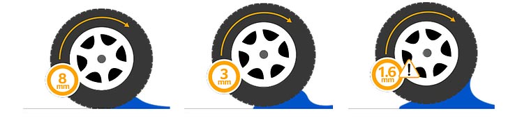 Lastiklerin diş derinliği 3 mm kalmışsa, lastikler yine de yüksek miktarda su deplasman kapasitesini koruyabilir. Bu noktadan sonra suda kızaklama riski önemli ölçüde artar. Ek olarak, azalan bir diş izi de frenleme performansını etkiler. Test sonuçlarının gösterdiği gibi, bir otomobilin lastiklerindeki diş ne kadar aşınırsa, tamamen durması o kadar uzun sürer.